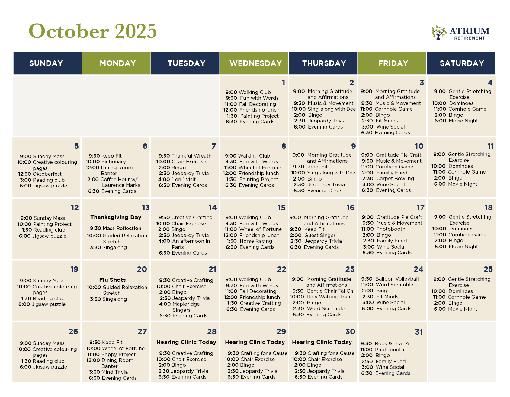 There’s always something happening here. From holiday celebrations and themed dinners to movie nights, games, and live music, every day brings something new to enjoy. Arts and crafts, music, and gardening spark creativity, while outings and volunteer programs bring people together. Our calendar keeps life fun, fresh, and full of connection.